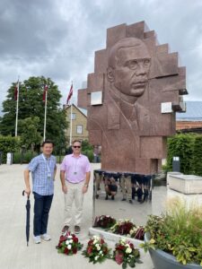 Honorary Consul, Eric Kalnins, pictured with Singapore Latvian Honorary Consul in front of the Zigfrids Anna Meierovics monument in Tukums, Latvia (July 2022).