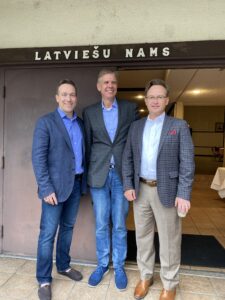 Consular Kalnins attending a Latvian dinner with Mikus Kins, Lauris Lambergs and others at the Latvian Community Center in Los Angeles in 2022.