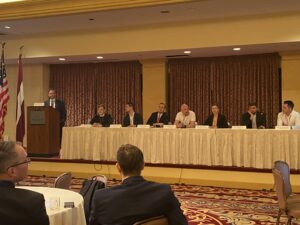 Eric Kalnins moderated a panel of Latvian entrepreneurs at the Spotlight Latvia event at the Biltmore Hotel in Los Angeles on April 1, 2022. The focus of the Spotlight Latvia event was on entertainment, multimedia and technology.